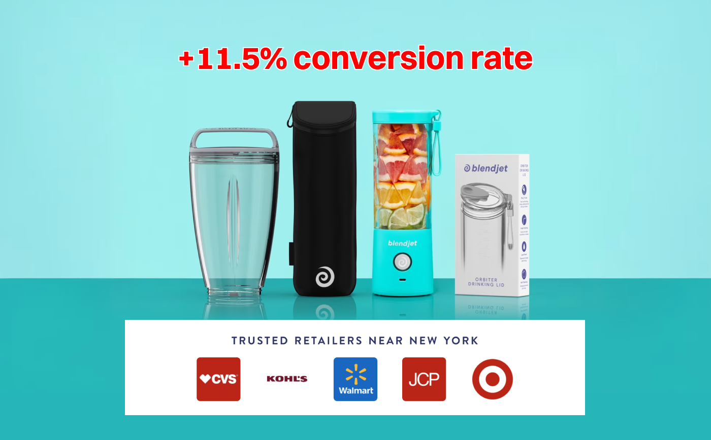 BlendJet achieved an 11.5% increase in online conversion rates by implementing StoreLocators' Retail Trust Badges on product pages, which display real-time availability at nearby major retailers, building instant credibility with their 10 million+ customers while driving a 300% boost in store locator usage.Retry